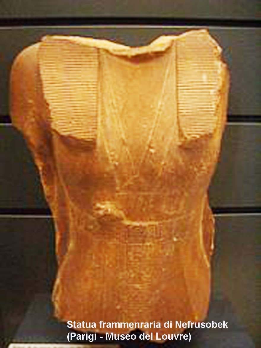Di questa regina, per la prima volta non ci sono dubbi sul fatto che sia stata faraone a tutti gli effetti. Questo sigillo ci dà la sua titolatura quasi completa: Mery(t) Sobek (amata da Sobek) poi il titolo di Horo (con la t del femminile), Meret Ra (amata da Ra). Segue il titolo delle Due Signore, Sat Sekhem Nebet Tawi (Figlia della Possente, Signora delle Due Terre), il titolo di Horo d’oro, Djed Kha(w) Stabile nelle apparizioni ed infine il titolo di Re dell’alto e Basso Egitto Nswt Bity, Sobek Neferw (o Neferw Sobek), La bellezza di Sobek. Per cui, a differenza di Nitoqerty, sulla quale ancora tanto si discute, qui siamo nel campo delle certezze. E, a differenza di Hatshepsut, che verrà sei dinastie dopo, lei mantenne le sue prerogative esclusivamente femminili.