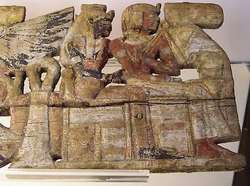 Le figure sono intagliate nella parete in legno di una portantina o di un trono.