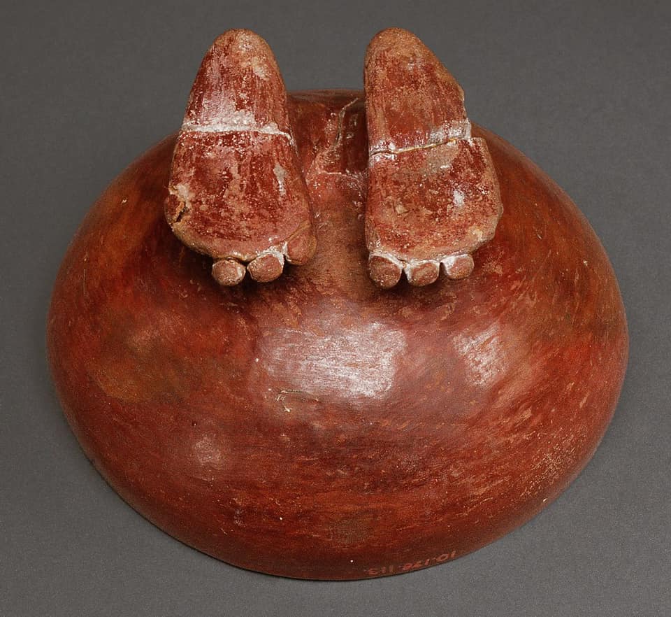 Ciotola con piedini umani. Realizzata in argilla del Nilo, la superficie è così liscia e levigata da apparire lucida .La forma la rende simile al geroglifico egizio che significa “portare” : in(i). Non è chiaro il suo utilizzo: forse ciotole del genere facevano parte del corredo funerario, come ciotole per le offerte di cibo dai vivi ai defunti (forse con i piedi la ciotola poteva raggiungere più speditamente il defunto