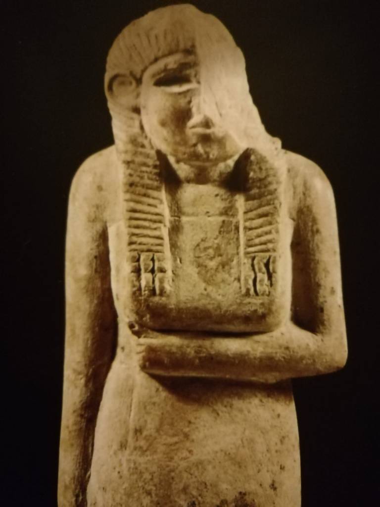 Questa antichissima opera rappresenta il punto d’incontro ideale fra l’arte protodinastica, di cui ricorda le opere di terracotta o avorio, e quella dinastia, di quest’ultima infatti contiene già la caratteristica costruzione su due assi: quello verticale è dato da elementi come il braccio destro disteso, quello orizzontale da elementi quali il braccio sinistro piegato. La statua rappresenta probabilmente una dea. Quest’opera è una delle prime statue litiche di figure umane erette che ci siano pervenute.