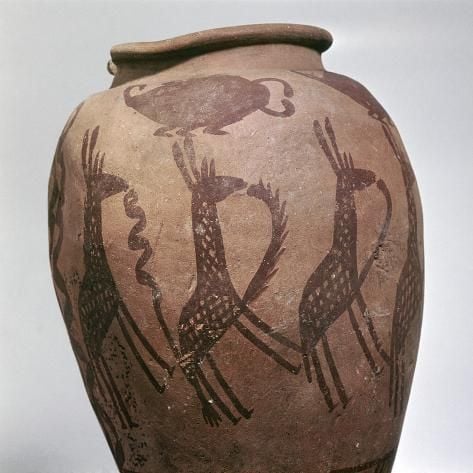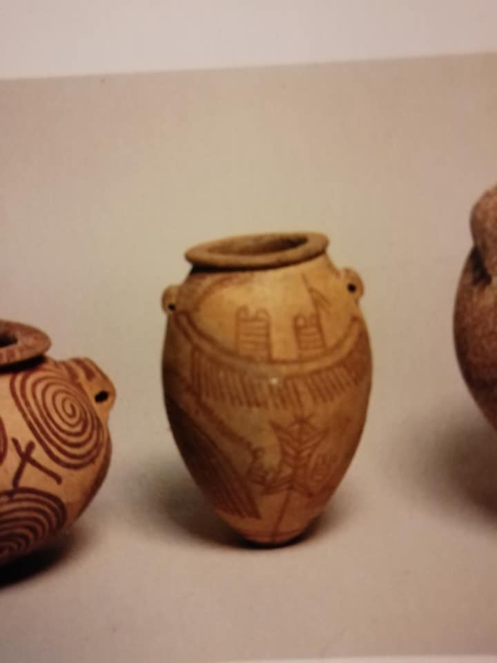 Il cosiddetto periodo Predinastico della storia dell’Egitto fu caratterizzato dalla fioritura di alcune culture locali convenzionalmente designate con i nomi delle località incui sono state trovate le loro testimonianze archeologiche. Tale è il caso di Naqada, un sito a circa 30 chilometri a nord di Luxor, sulla riva occidentale del Nilo. La zona, scavata alla fine dell’Ottocento, ha restituito un’enorme quantità di reperti, soprattutto ceramica, pettini in avorio, tavolozza per il belletto e coltelli in selce che testimoniano l’esistenza, tra il V e il IV millennio a. C, di una civiltà omogenea, caratterizzata da un alto livello di sviluppo produttivo. I vasi di Naqada rappresentano un gruppo piuttosto omogeneo, che si può suddividere in due categorie cronotipologiche, identificate come Naqada I e Naqada II. Questi vasi appartenuti, appartenuti alla seconda serie, sono realizzati in Argilla chiara con motivi geometrici, spirali e archetti, e immagini di imbarcazioni dipinte di rosso.Le barche, certamente connesse allo sviluppo della navigazione fluviale dell’epoca, oltre alle figure di animali e piante dell’ambiente nilotico sono i tipici temi raffigurati i della produzione vascolare di ‘Naqada II”, che trasse spunto dall’ ambiente naturale circostante per queste prime e antichissime espressioni artistiche.