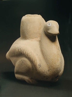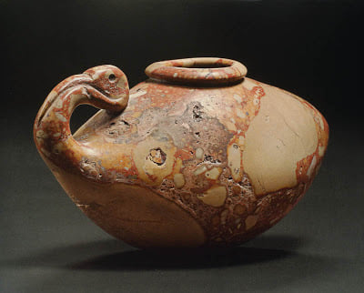 Questo vaso votivo del Predinastico (per defunti o divinità) fu realizzato con una tecnica particolare : modellato inizialmente a forma di uovo, è stato poi scolpito ulteriormente fino a ricordare un ibis che è qui realizzato facendo coincidere il becco con il collo e piegandoli entrambi all’indietro. Il vaso è scavato all’interno sino ad ottenere pareti sottilissime