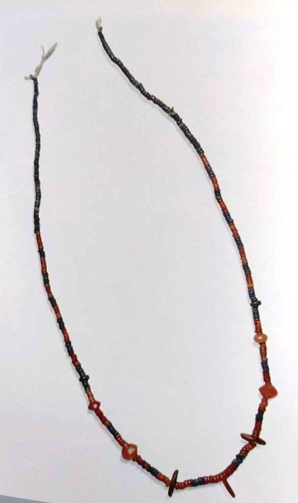 Lunga collana costituita da piccole perline tubolari di corniola e faience. Nella parte centrale sono inserite alcune perline sfaccettate di corniola.