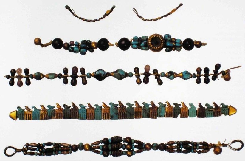 I singoli componenti erano stati tenuti in posizione dalle bende, per cui è stato possibile ricostruire i bracciali nel loro aspetto originario; tre di essi sono realizzati con perle d’oro, turchese, lapislazzuli e ametista.