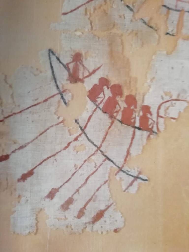 Il clima caldo e secco dell’Egitto ha contribuito in maniera determinante alla conservazione di antichi manufatti altrimenti facilmente deperibili, come quelli realizzati in legno, stoffa, pellame e fibre vegetali. Il telo di lino dipinto rinvenuto a Gebelein nel 1930 da Giulio Farina, collaboratore di Schiapparelli e poi suo successore alla guida del Museo Egizio, è uno dei più antichi reperti di questo genere proveniente dal mondo antico. La stoffa , rinvenuta nella fossa in cui era stato sepolta una persona in posizione rannicchiata, è decorata con scene policrome dipinte di nero, rosso e bianco che raffigurano imbarcazioni a remi, un uomo vicino a rivoli d’acqua, un episodio di caccia all’ippopotamo e una danza rituale, probabilmente connessa con i riti funebri celebrati in favore del defunto. I disegni, pur nella loro semplicità, sono estremamente realistici e costituiscono quindi un documento prezioso per conoscere quale fosse la tecnica di navigazione fluviale praticata in Egitto in quelle epoche remote. Il telo testimonia inoltre l’alto livello raggiunto più di cinquemila anni fa dall’industria tessile locale, basata già allora sulla coltura specializzata del lino che sarebbe rimasta anche in seguito una delle voci più importanti dell’economia egizia.