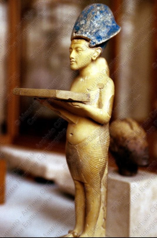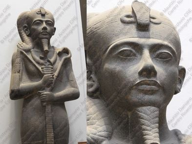 Anche questa statua del dio Amon, nel cuore del complesso di Amon a Karnak, raffigura Tutankhamon; nelle immagini, com’era qualche anno fa, priva del naso, e oggi, dopo il ritrovamento e restauro del naso