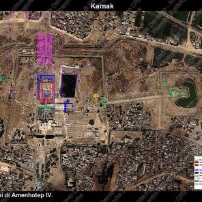 Nell’immagine sotto, pianta di Karnak con (in viola) le costruzioni di Amenhotep IV e l’area Est ove si trovavano i colossi (pianta su base Google Earth; cartografia © M. Damiano/Archivio CRE); in basso, a sinistra immagine di Karnak est, al centro immagine degli scavi del 1926 nella quale si notano i colossi e a destra la facciata del tempio di Amenhotep IV (disegno e © M. Damiano/Archivio CRE).