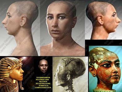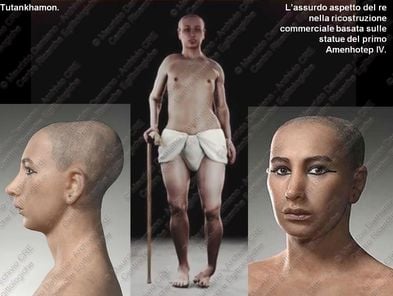 Per avere la misura di quanto siano superficiali, si noti uno dei caratteri più evidenti: il mento rientrante (assente nel cranio e in qualsiasi ritratto del faraone); si compari poi con l’immagine in basso a sinistra: la “recente ricostruzione somatica computerizzata”, che è esattamente all’opposto, caratterizzata da un forte prognatismo; e, per finire, un’ennesima ricostruzione, questa volta più vicina ai ritratti, ma anch’essa intrisa di fantasia.