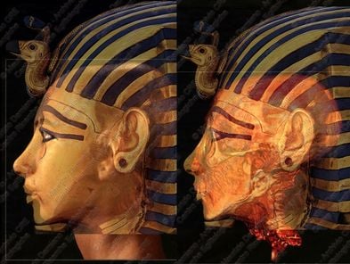 IN BASSO: A sinistra, la maschera con i tratti reali di Tutankhamon e la sovrapposizione (non forzata, non deformata) del cranio visto dalla TAC con la muscolatura. A destra, la sovrapposizione della maschera al cranio; si noti come, dalla fronte al mento, vi sia una coincidenza perfetta, particolarmente dal mento, che ha un prognatismo nella norma e si adatta perfettamente al ritratto della maschera