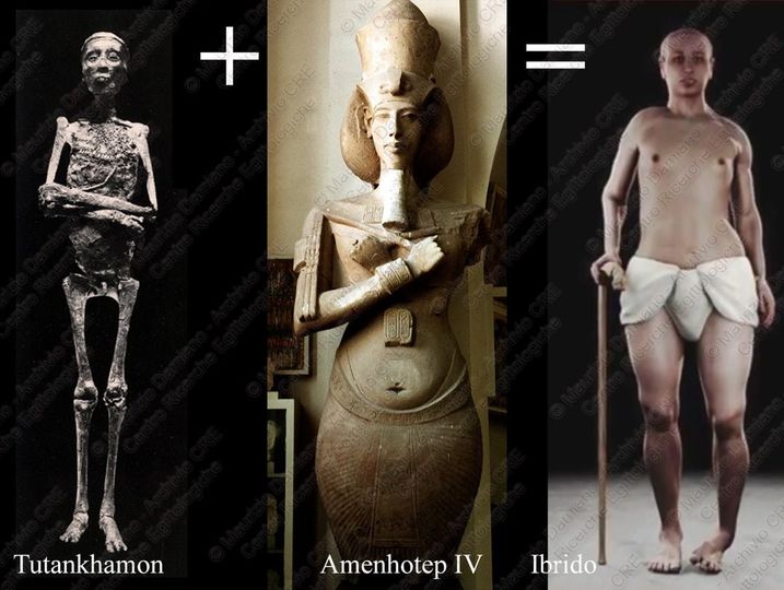 Visto il cranio scendiamo al corpo: i “ricostruttori” hanno fatto un’operazione del tutto antiscientifica, un pastrocchio assurdo: hanno del tutto buttato a mare la vera documentazione egizia e, dando per certa al 100% la paternità di Akhenaton (è certa la correlazione fra Tutankhamon e il corpo della KV 55, di cui l’identità non è ancora al 100%, anche se ormai lo è quasi del tutto), hanno attribuito al corpo di Tutankhamon l’aspetto del tutto immaginario dell’Akhenaton erroneamente dedotto negli anni ’20-’60 sulla base delle raffigurazioni del primo periodo tebano, poi amarniano.