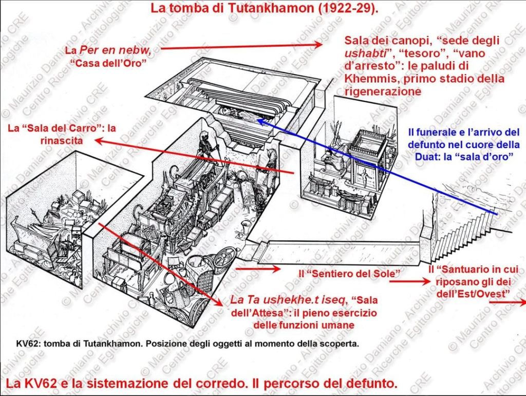 Andiamo con ordine. Benché non fosse stata prevista per il faraone, ma per un alto personaggio (probabilmente Ay, che poi prese quella in origine destinata a Tutankhamon, WV 23, che era ancora abbozzata e rimase incompiuta), la tomba fu adattata per il sovrano; benché con lo schema di una tomba privata intende comunque riprodurre il cammino di rinascita del re, che vediamo nello schema. Questo punto è importante, poiché tutto in una tomba è volto alla resurrezione (nell’aldilà, non in questo mondo) del sovrano; che i suoi ritratti siano fedeli alla realtà è fondamentale per la rinascita.