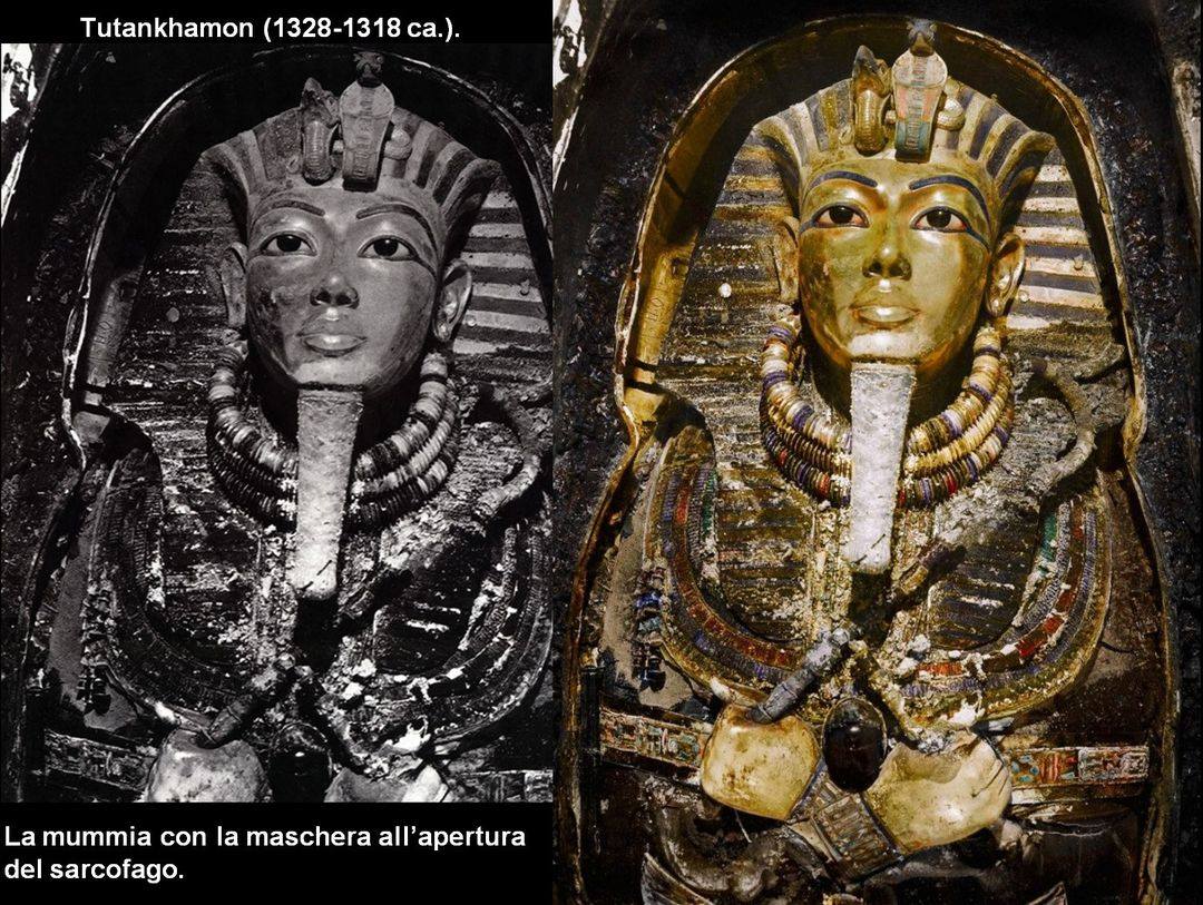 N ALTO: il corpo con la testa ancora coperta dalla maschera all’apertura del sarcofago (a destra, colorazione moderna).