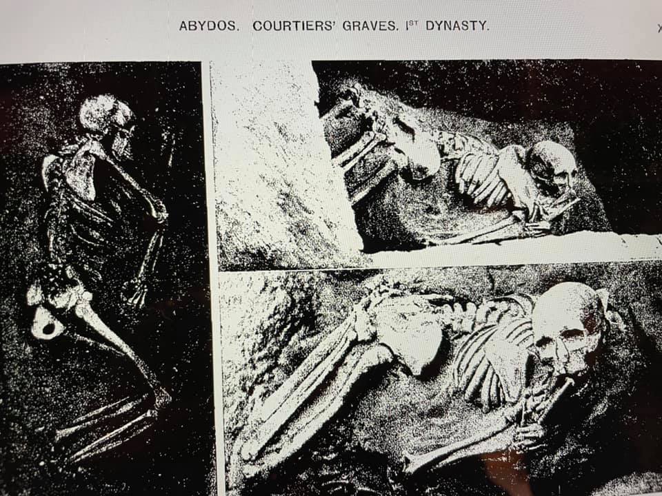 La pratica di porre delle vittime sacrificali nella tomba del re iniziò con il faraone Aha o Menes, successore di Narmer, I Dinastia, 3100 a.C. : circa 50 persone accompagnarono il sovrano nel suo ultimo viaggio. Con loro furono sacrificati degli asini, come bestie da soma, e 7 giovani leoni maschi, simbolo della forza e coraggio del re. Flinders Petrie individuò le seguenti sepolture secondarie ad Abydo: