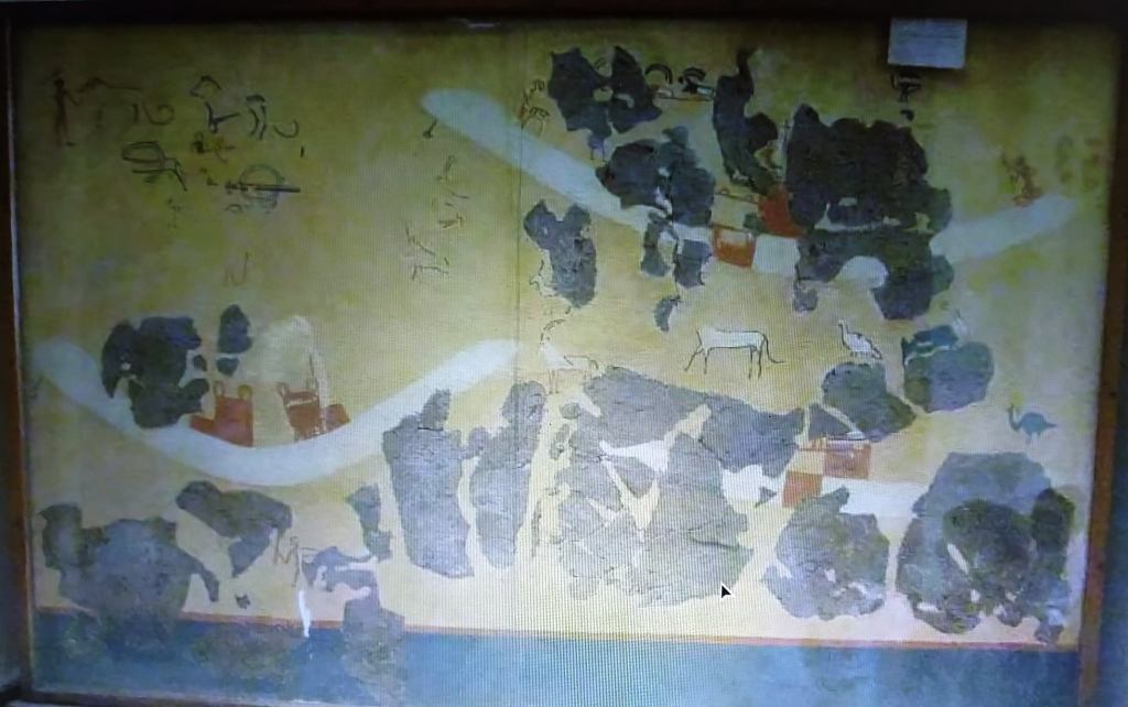 La fotografia mostra i resti del muro della Tomba 100, di Ieraconpoli (circa 3600 a.C.) che è sotto vetro, in una piccola sala poco visitata del Museo del Cairo. Sfortunatamente gran parte del dipinto è andato distrutto (circa due terzi dell’intero muro), mostrando il mattone di fango sottostante.