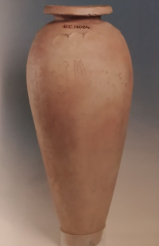 Grande giara dal corpo slanciato,su base stretta. Collo breve dotato di ampio labbro che si espande a disco. All’altezza della spalla sono presenti appigli concatenati in leggero rilievo, destinati probabilmente a rendere più agevole lo spostamento del vaso. Sotto le sporgenze è leggibile il nome Haty, cinto da un semplice “serekh” preceduto da un segno geroglifico raffigurante una mazza piriforme.
