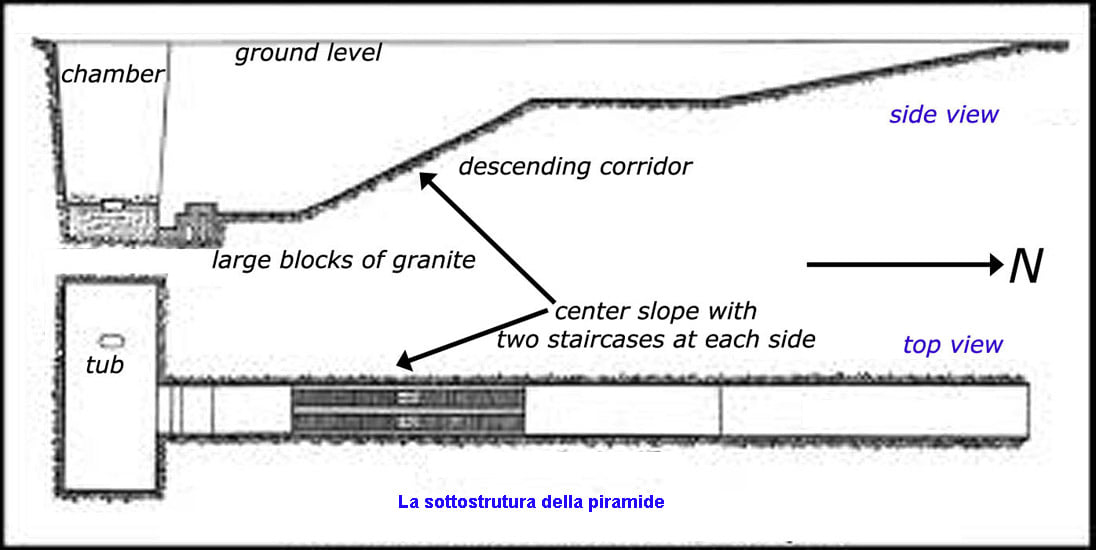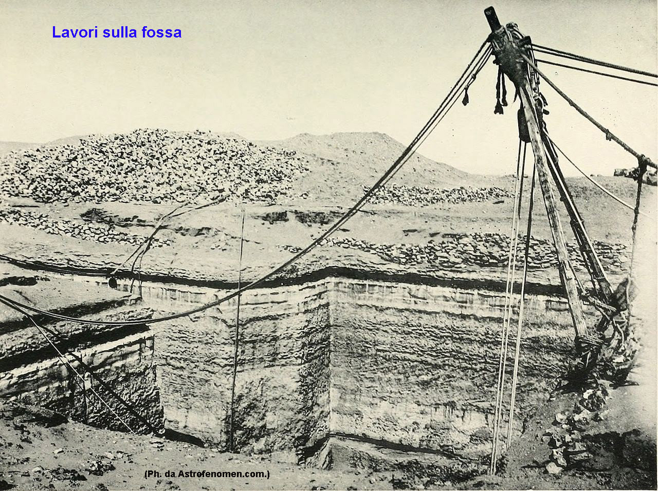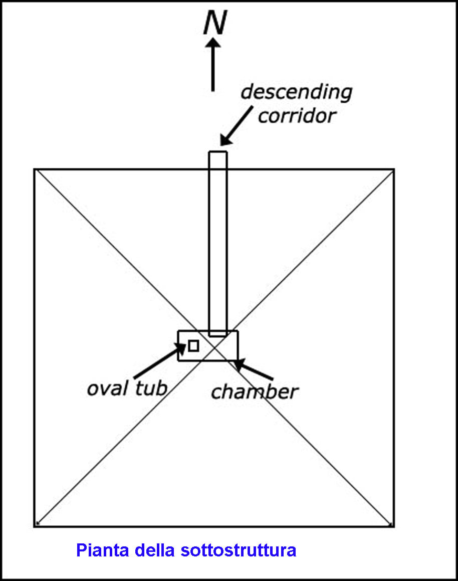 Il suo rapporto originale, in francese, contiene descrizioni dei corridoi sotterranei e di un’enorme fossa, (la camera funeraria?), orientata est-ovest ubicata al centro della costruzione incompiuta sul cui fondo giacciono enormi blocchi di granito e calcare a formare le fondamenta.