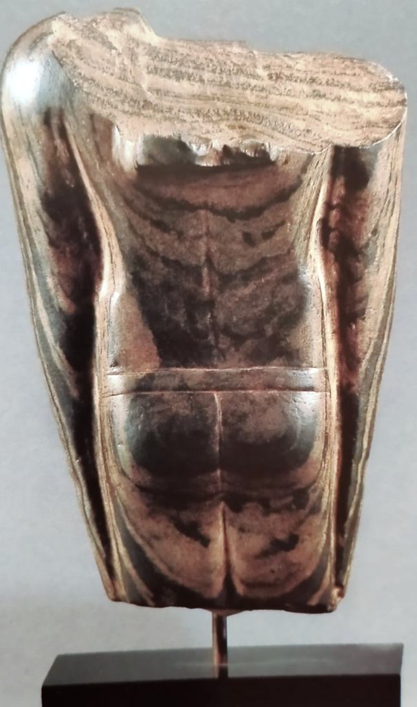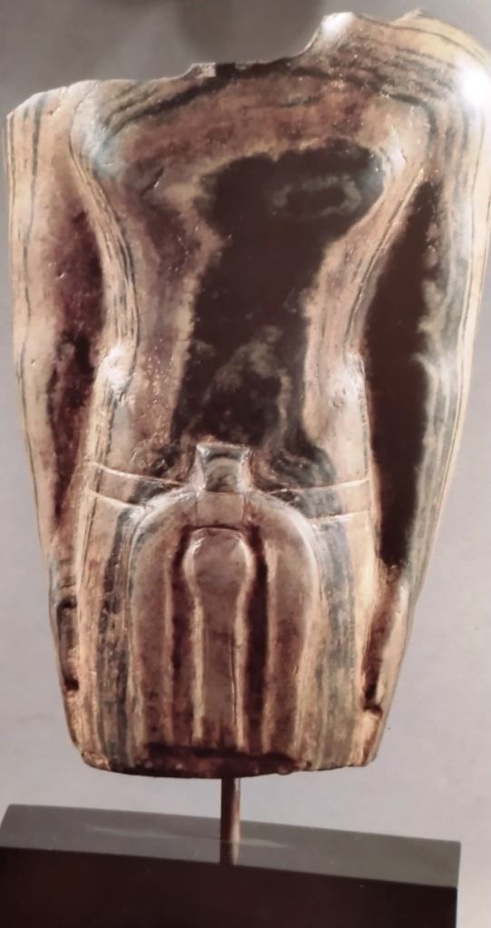 Frammento di statuina di personaggio virile. Protodinastico, Dinastia 0, Horus Narmer, circa 3060-3000 a.C. Roccia sedimentaria striata. Altezza cm. 11,2. Lunghezza cm. 7,5. Larghezza cm. 4,1. Provenienza ignota. Monaco, Staatliche Sammlung Agyptischer Kunst.