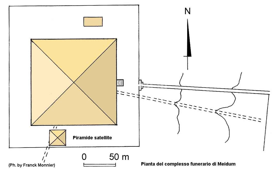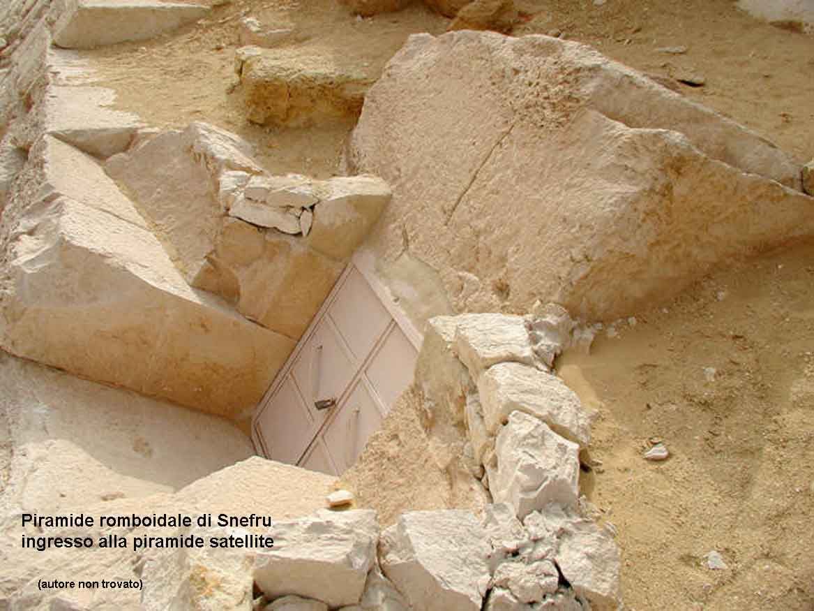 La prima si dovrebbe trovare presso la piramide di Snefru (Uni), a Meidum. Oggi della piramide satellite rimangono solo alcune tracce, (ne resta solo la base di 26,65 m di lato). Di Snefru è pure la cosiddetta “piramide satellite meridionale”, accessoria del Complesso piramidale più conosciuto con il nome di Piramide Romboidale. Scoperta da Lepsius ed inventariata con la sigla LVII si trova ancora oggi in ottimo stato di conservazione anche se si può accedere all’interno solo per un breve tratto a causa dell’insabbiamento. Venne esplorata nel 1946 da Abdel Salam Hussein, non presentava alcuna traccia di sepoltura, al suo interno Hussein rinvenne solo alcuni cocci di vaso in terracotta. I resti del rivestimento in calcare poggiano su uno zoccolo di massi, su alcuni di questi è presente il nome di Snefru e il grafema hw indicante l’antico nome della piramide. Snefru si fermò qui perché la piramide rossa è priva di piramidi accessorie.