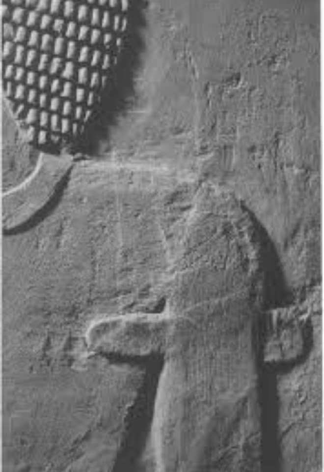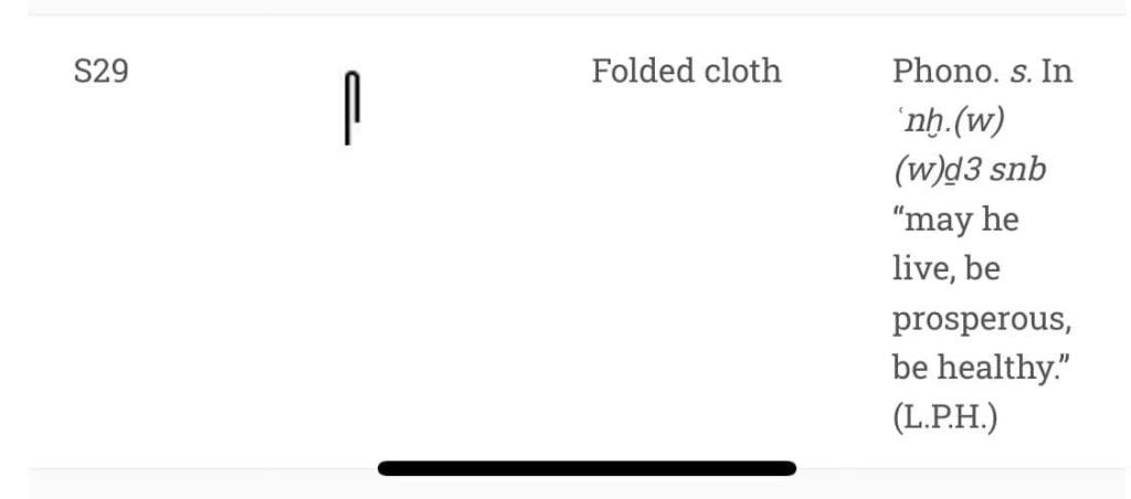 Lo studio dei geroglifici potrebbe venirci in aiuto. Il pezzo di stoffa è rappresentato infatti nello stesso modo (con le due estremità arrotondate) anche come Geroglifico N18, (Gardiner’s sign List) o come geroglifico S29 (tessuto piegato).Nelle statue di pietra, essendo difficile rendere la parte posteriore del tessuto, questo sarebbe reso come arrotondato da entrambi i lati. Nel rilievo parietale di una tomba, la B4, scoperta a Saqqara da Mariette, e risalente alla metà della V Dinastia, il tessuto piegato viene rappresentato sotto il braccio aderente al corpo (vedere foto) nella stessa forma che è normalmente rappresentata come stretta in pugno dalle statue. Questo rilievo è leggermente posteriore alla prima apparizione di questo oggetto nelle mani delle statue, ma non c’è ragione di credere che il geroglifico N18, che rappresenta un pezzo di stoffa, non fosse familiare agli scultori della IV dinastia.