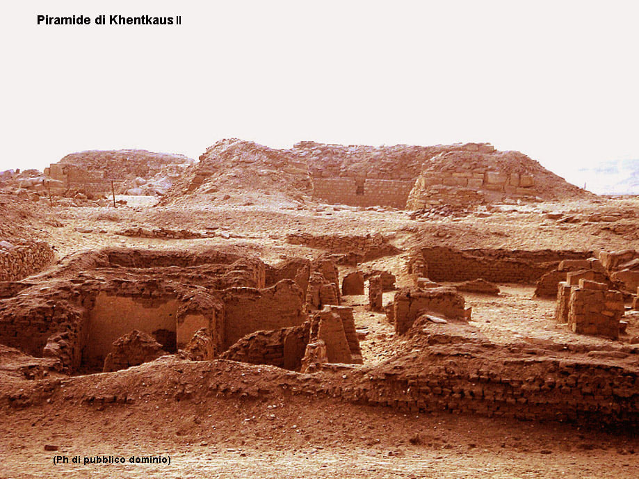 Secondo un’altra iscrizione pare che la piramide, iniziata per la “sposa reale Khentkaus II” dopo la lunga interruzione sia stata completata per la “regina madre Khentkaus II”. Il complesso della regina Khentkaus II comprende il tempio funerario, eretto contro la parete orientale della piramide. Il tempio deve essere stato costruito in due tempi diversi, cosa deducibile esaminando il materiale usato. Per la prima parte è stato usato calcare mentre la seconda parte è solo in mattoni crudi. La prima parte appare più curata e comprende un cortile aperto con pilastri ed una sala cerimoniale che doveva contenere le statue della regina, da qui si accedeva all’aula sacrificale le cui pareti apparivano decorate con raffigurazioni a bassorilievo rappresentanti scene di un banchetto funebre, presentazione di doni da parte di una processione di donne, macellazione di animali sacrificali e l’incontro della regina coi suoi parenti. Su un pilastro compare la raffigurazione della regina che porta l’uraeus sulla fronte, simbolo riservato solo ai sovrani. Sorprendente un particolare che si riscontra per la prima volta nell’Antico Regno, all’interno del complesso di Khentkaus II compare una piccola piramide cultuale situata presso l’angolo sud-est della piramide maggiore. Anche qui incontestabili prove archeologiche attestano che la regina fu effettivamente sepolta nel suo complesso funerario e che il culto si sia protratto per lungo tempo. Sicuramente, dopo la morte del marito faraone, come già successo in precedenza per Khentkaus I, la regina dovette difendere con la propria autorità i diritti del figlio, erede al trono evidentemente ancora minorenne. Mentre per la prima non ci è dato a sapere di chi si trattava, per Khentkaus II con ogni probabilità si trattava di Niuserre.