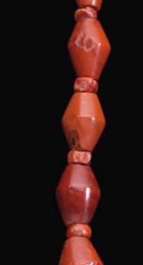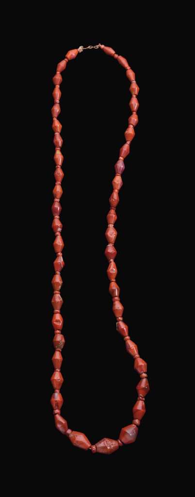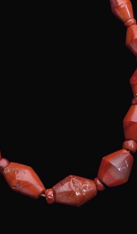 Stupenda collana in diaspro rosso, XVIII-XX dinastia 1550-1077a.C. Composta da perle biconiche intervallate da distanziatori in cornalina. lunga 78,1 cm Foto: Christie’s