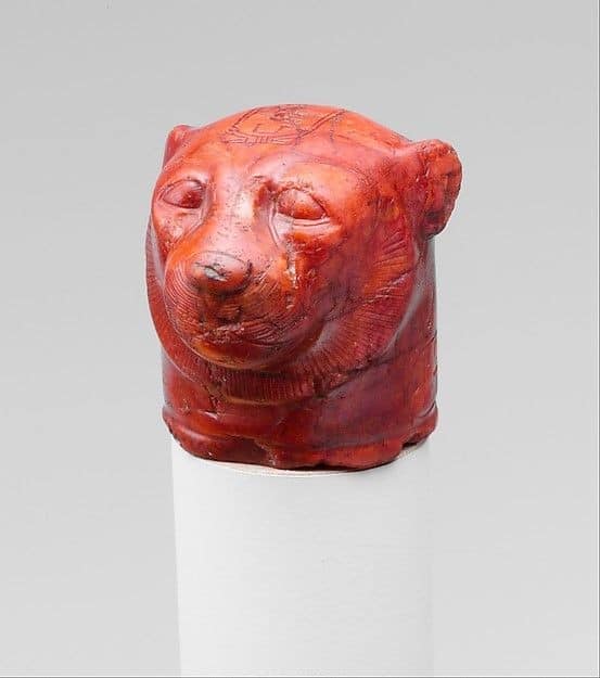 Testa di leopardo con il nome di Hatshepsut. Si conoscono due pezzi da gioco di Diaspro quasi identici a questo. Uno è in prestito all’Antikenmuseum di Basilea, l’altro è al museo egizio del Cairo. Presumibilmente tutti e tre facevano parte di un set usato per il gioco del senet. La testa di leopardo è stata scolpita con grande dettaglio. Nuovo regno XVIII dinastia regno Hatshepsut e Tutmosis III c.a. 1478-1458a.C.