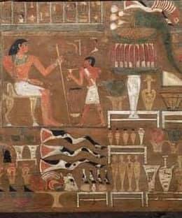 Il punto focale è la falsa porta, decorata in modo elaborato, attraverso la quale il ka può passare tra l’aldilà e il mondo dei vivi. Djehutynakht si siede davanti alla falsa porta e riceve un’offerta di incenso. Di fronte e sotto di lui sono rappresentate ricche offerte ordinatamente ammucchiate, tra cui un vaso da vino cerimoniale di grandi dimensioni, oli sacri, le gambe e le teste di bestiame maculato, tavoli carichi di frutta, verdura, carne, pane e oche magnificamente dettagliate.