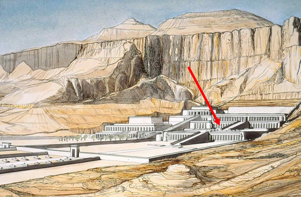 Nelle immagini, pianta del sito di Deir El-Bahari elaborata da Golvin, ove il portico di Punt è indicato da una freccia da me apposta