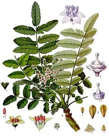 Nelle immagini, uno dei ceppi ritrovati a Deir el-Bahari e l’albero dell’incenso (boswellia sacra).