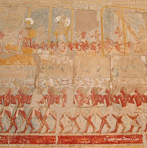 Dalle iscrizioni del portico si apprende che lo stesso Amon aveva dato ad Hatshepsut l’ordine di organizzare il viaggio garantendole il successo nell’impresa che avrebbe confermato la benevolenza divina nei suoi confronti.