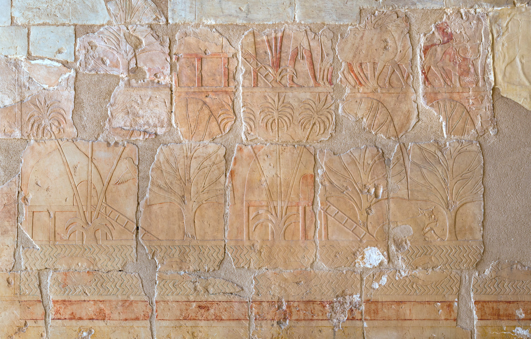 I marinai egizi trasportano mediante lunghe stanghe alcuni alberelli che le scritte identificano come sicomori odoriferi, ossia alberi della mirra; per proteggerne le radici utilizzano dei canestri di vimini riempiti di terra; i nativi invece caricano tronchi di ebano, alcune scimmie, una giraffa, un elefante ed un cavallo; in altri punti del rilievo si vedono gli alberi completamente cresciuti che presentano tra il tronco e i rami delle piccole protuberanze di gomma resinosa stillata attraverso le spaccature.