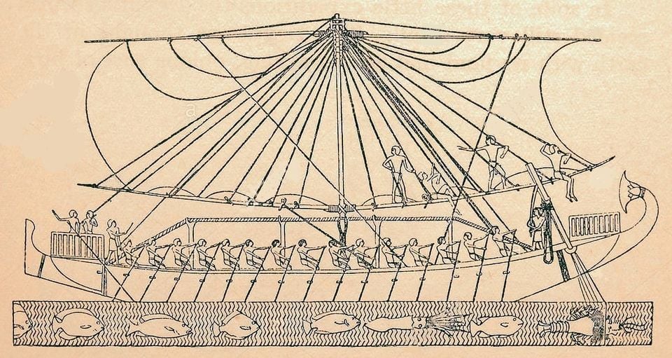 La spedizione consisteva quindi di circa 210 persone distribuite su cinque navi: il rilievo mostra i rematori ai remi; i capivoga in piedi alle loro spalle sulla piattaforma di prua; il timoniere a poppa; il capitano, riconoscibile dal bastone del comando, in piedi sulla piattaforma a prua che guarda nella direzione verso cui è diretta la nave.