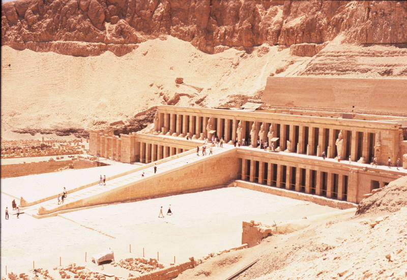 Ricostruzione del tempio di Hatshepsut, a Deir El Bahari. (Tebe Ovest). In primo piano si vede il grande cortile cintato in fondo al quale si elevano le ampie terrazze e i portici che ospitavano splendidi rilievi e varie cappelle. Alle spalle del tempio si eleva la ripida scarpata della montagna tebana, che forma lo splendido paesaggio in cui il tempio si inserisce armonicamente. I lavori di restauro ne hanno oggi restituito la struttura e gli scavi hanno portato alla luce molte delle statue che ne ornavano corti e viali, nonché rivelato la presenza di piccoli bacini e giardini dedicati al dio Amon che ravvivano l’arido paesaggio desertico.