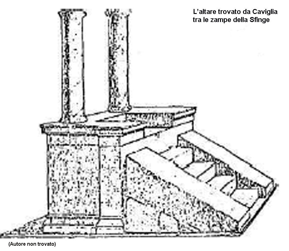 L’altare consisteva in una piccola costruzione con due colonne poste in modo che lo sguardo della Sfinge potesse passare esattamente in mezzo ad esse. Secondo alcuni egittologi la costruzione, ricorda un altare rituale risalente all’epoca romana. Si sa che sia i greci, prima, poi i romani e successivamente gli arabi seguirono la tradizione di rendere omaggio alla Sfinge perpetuando l’idea che fosse opera degli dei. Non venne ritrovato altro nonostante siano state rinvenute immagini in cui la Sfinge viene rappresentata con una statua, o secondo alcuni, una colonna situata di fronte al petto.