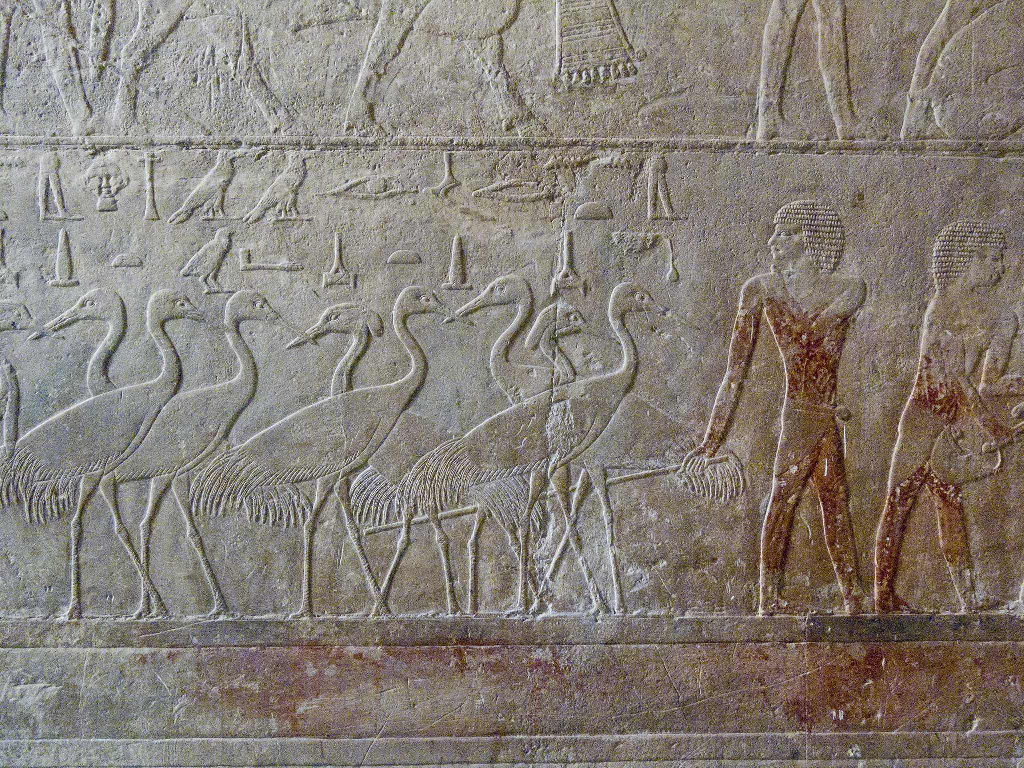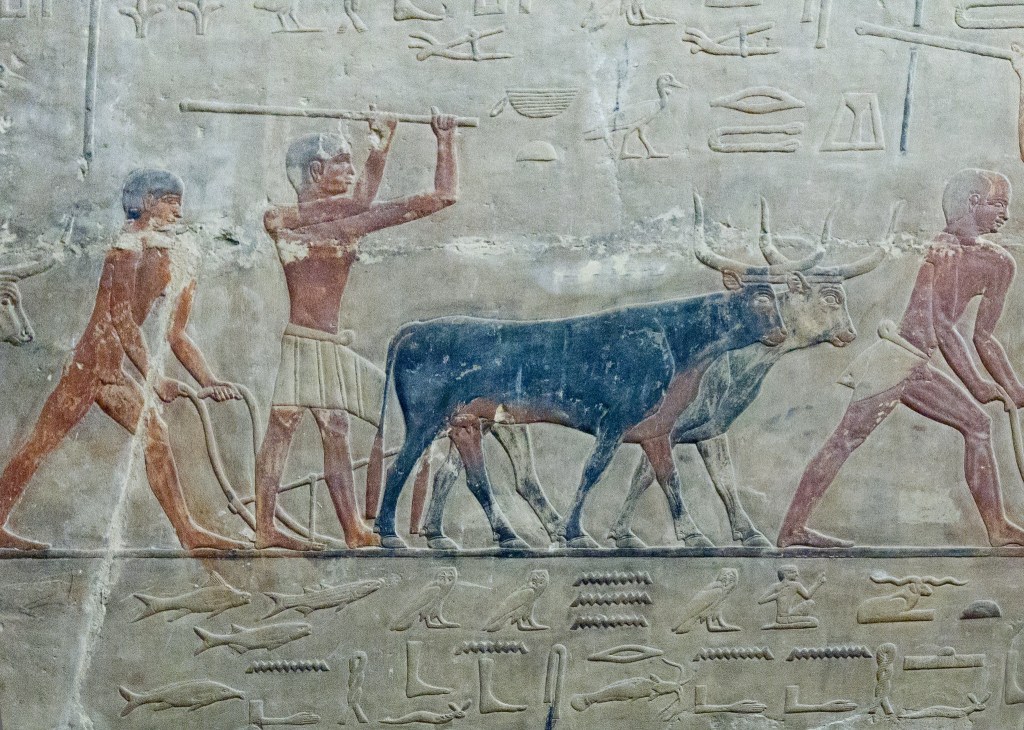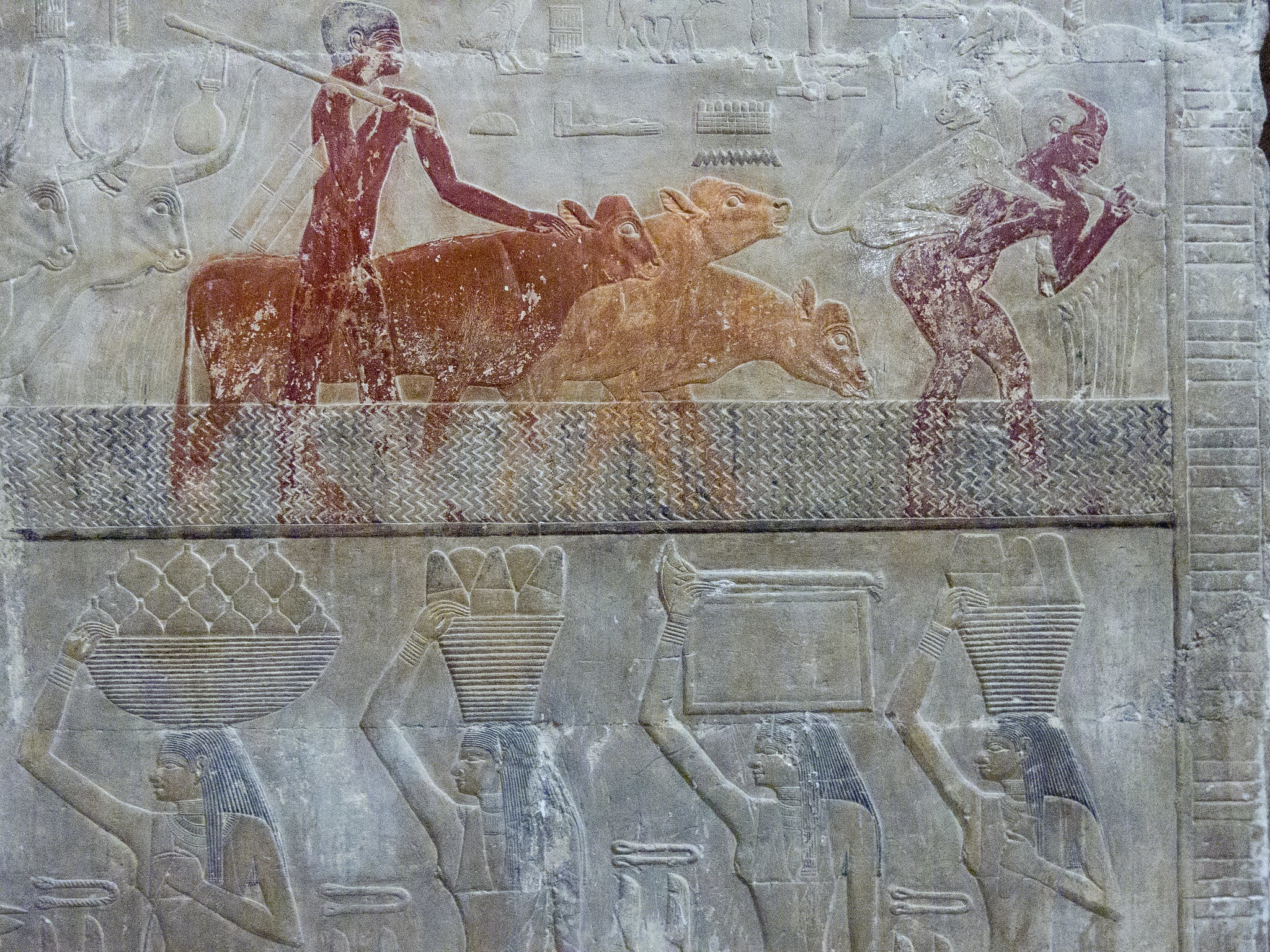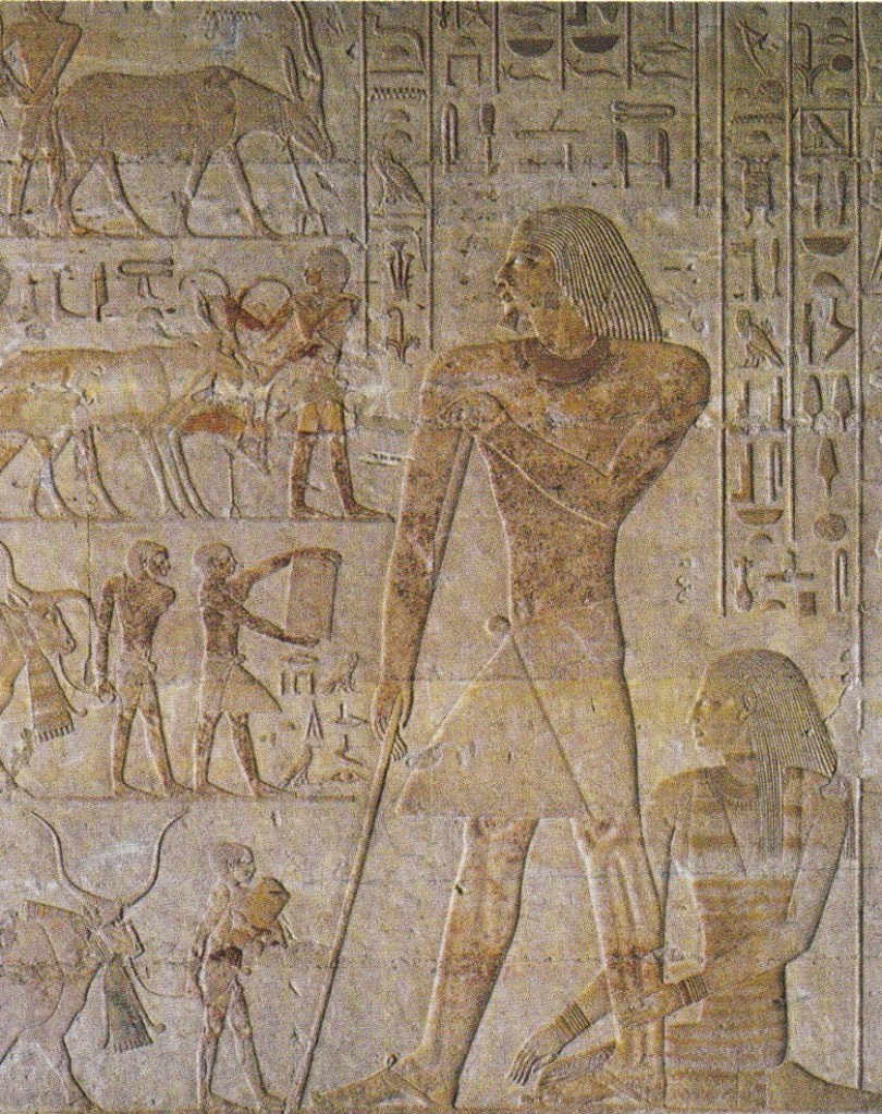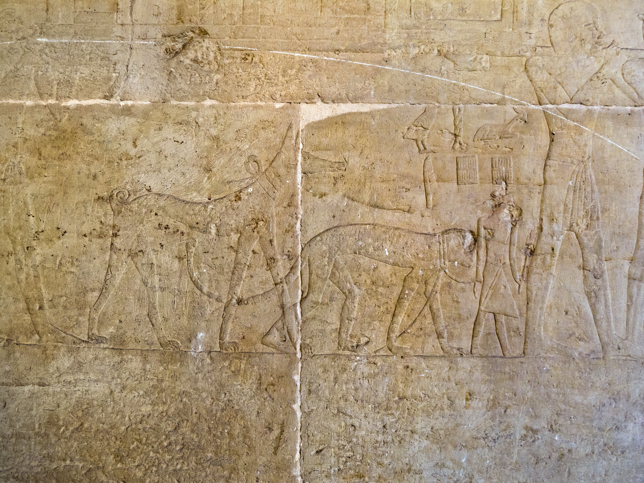 La “scena campestre”, una delle più famose della mastaba. Nel registro superiore, sulla destra è raffigurata la mungitura di una mucca con le zampe posteriori legate, a sinistra tre coppie di buoi tirano l’aratro. Nel registro inferiore gli uomini a destra dissodano i campi, un gruppo di ovini procede spronata dai pastori con la frusta per far penetrare con i loro zoccoli i semi in profondità. Per ultimo segue un contadino con la borsa delle sementi