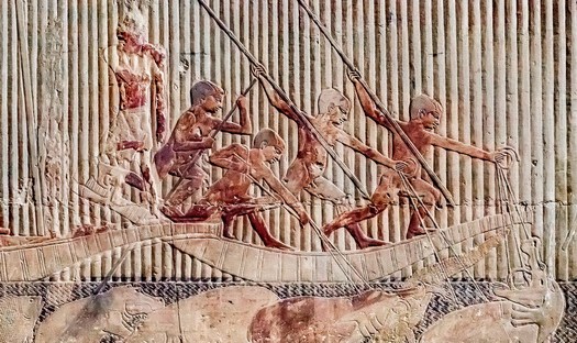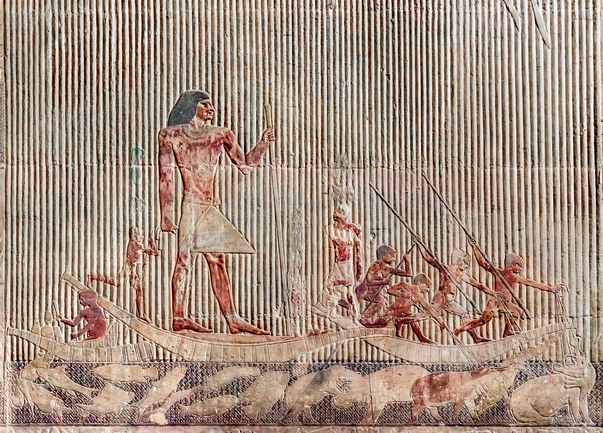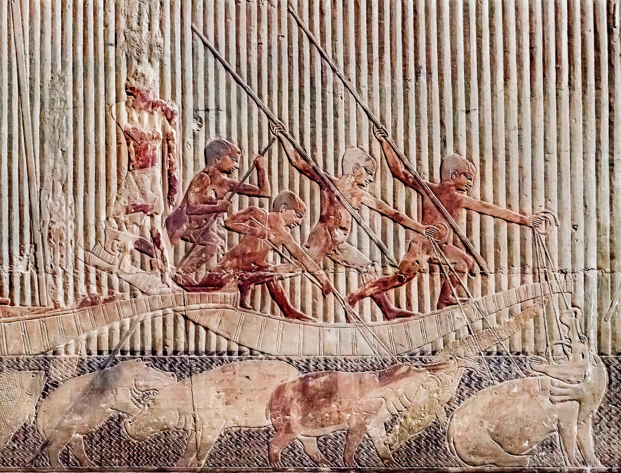 E si può vedere quale potere avesse un funzionario come il signor Ti. I malfattori sono condotti per il giudizio dinanzi alla sua dimora, trascinati al suolo dagli sbirri, e strangolati in modo rozzo e selvaggio. Schiere di contadine gli recano doni, servi conducono e uccidono animali da sacrificio. Ed infine la vita privata di Ti, come attraverso una finestra della sua dimora: Ti a tavola, Ti con la moglie, con la famiglia, Ti – e questo è uno dei rilievi più belli – a caccia tra le folte macchie di papiri. In questa raffigurazione, i marinai arpionano ippopotami, uno dei quali addenta un coccodrillo.