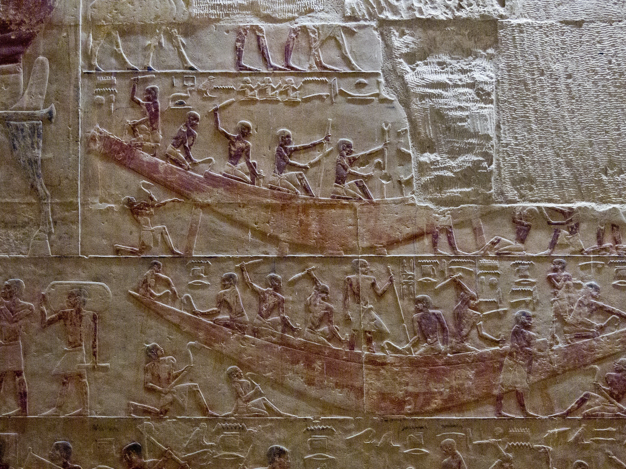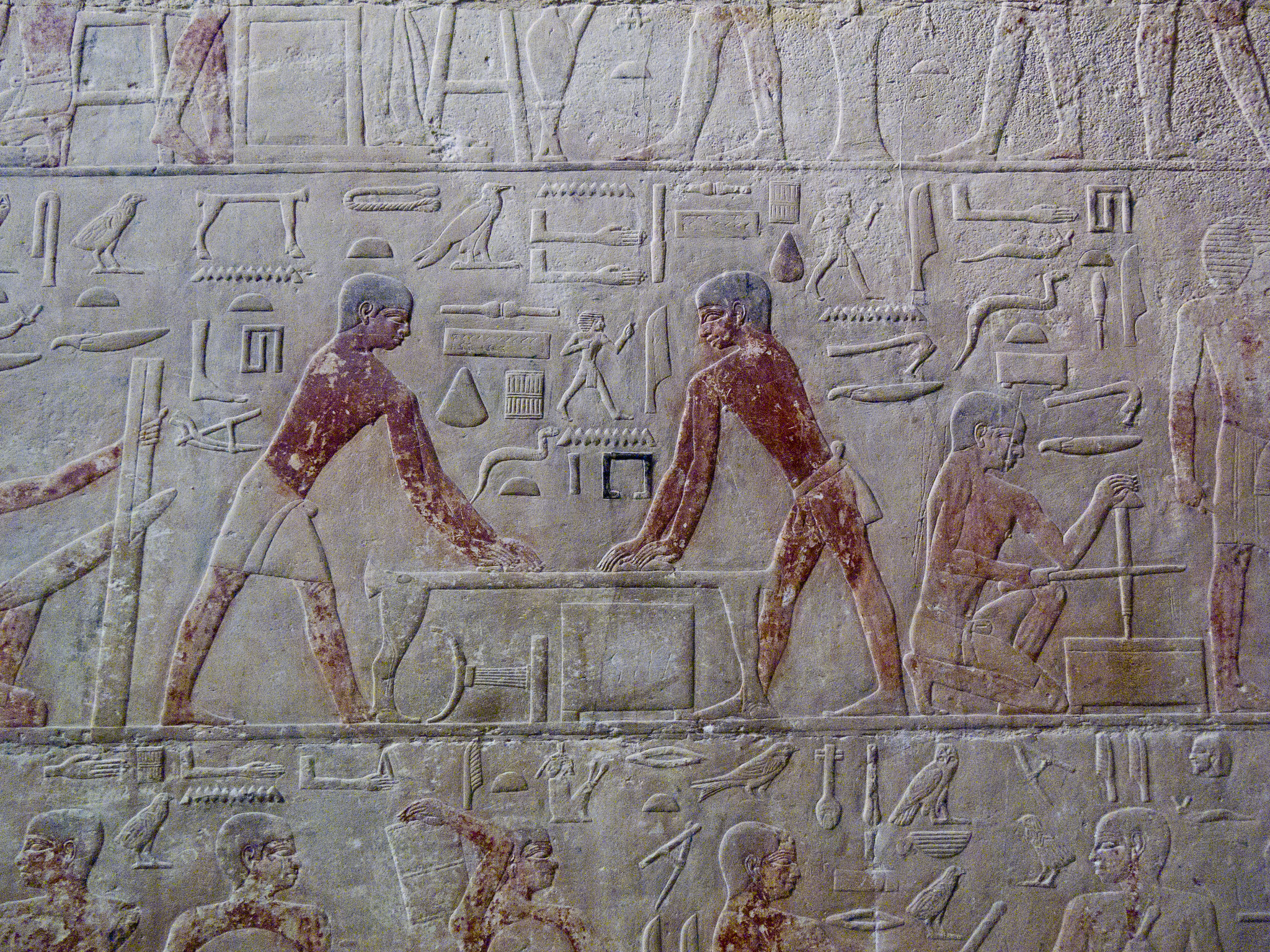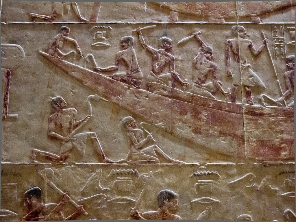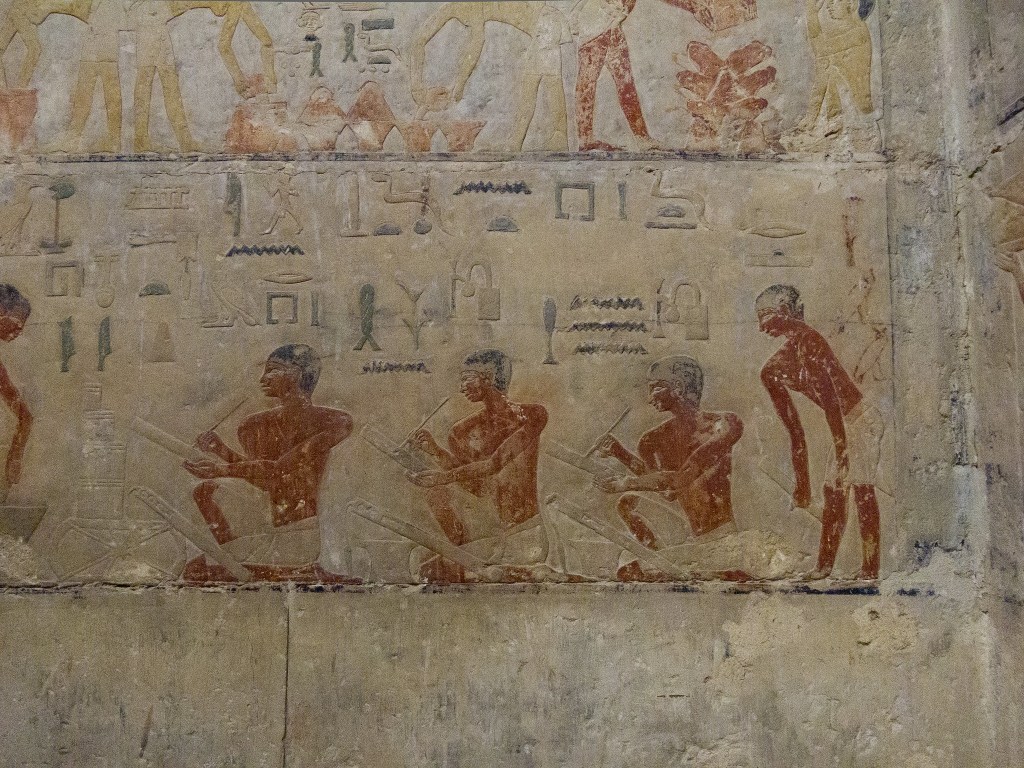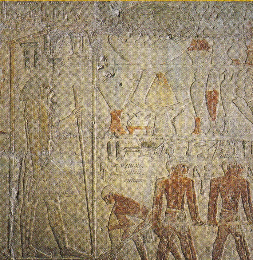 E dalle pareti della mastaba emerge, incredibilmente viva e vivida la vita di tutti i giorni: la preparazione dei campi, i mietitori, i guidatori di asini, la trebbiatura, la spulatura dei cereali; è possibile assistere alle varie fasi della costruzione delle navi di quattro millenni e mezzo fa: la segatura dei tronchi, la lavorazione delle assi, il maneggio di squadre, scalpelli e altri utensili. Per la gioia di innumerevoli studiosi di tutte le discipline afferenti all’Antico Egitto si possono riconoscere con chiarezza i vari arnesi, e vediamo come fossero già noti la sega, la scure e perfino il trapano.