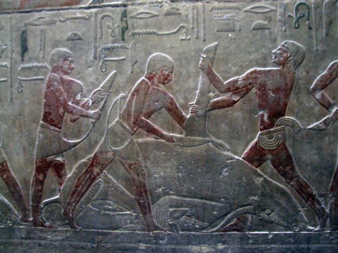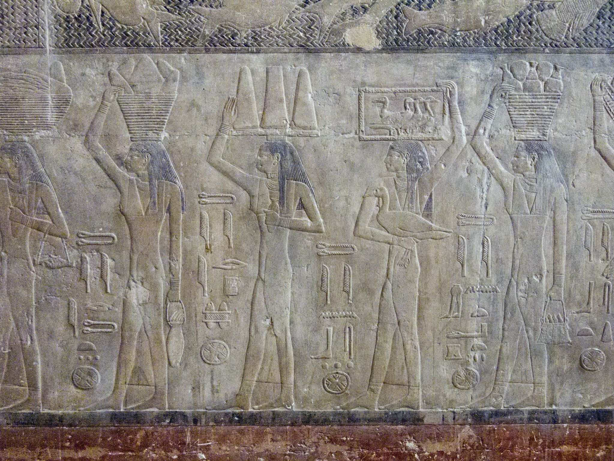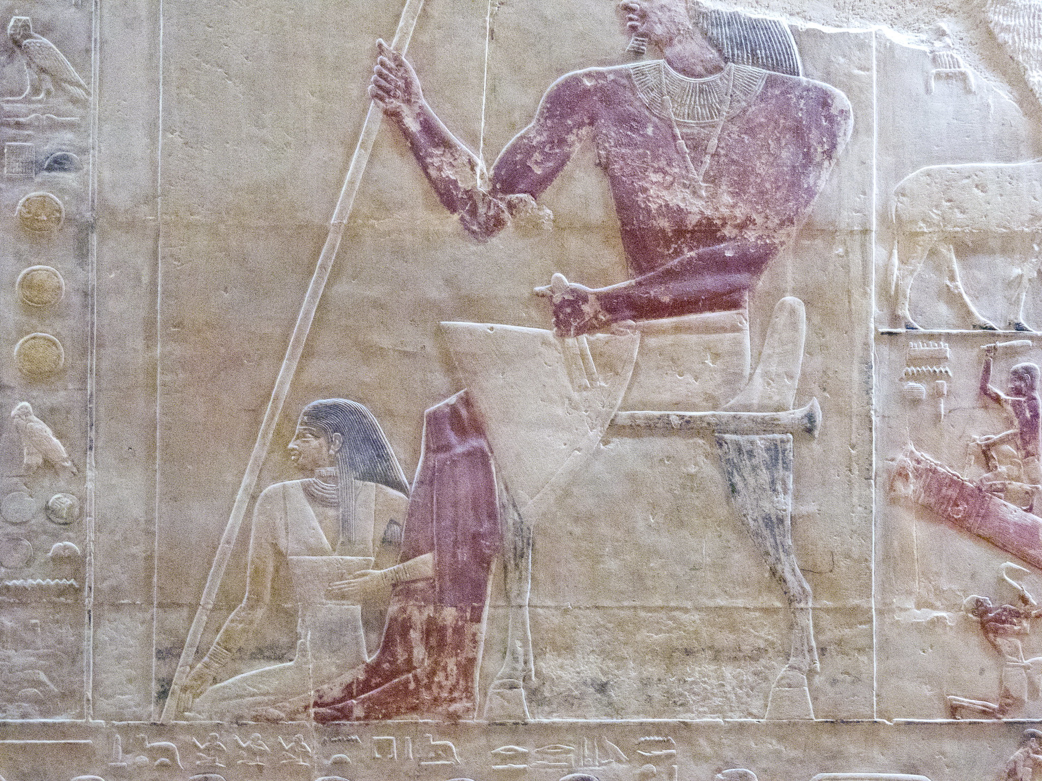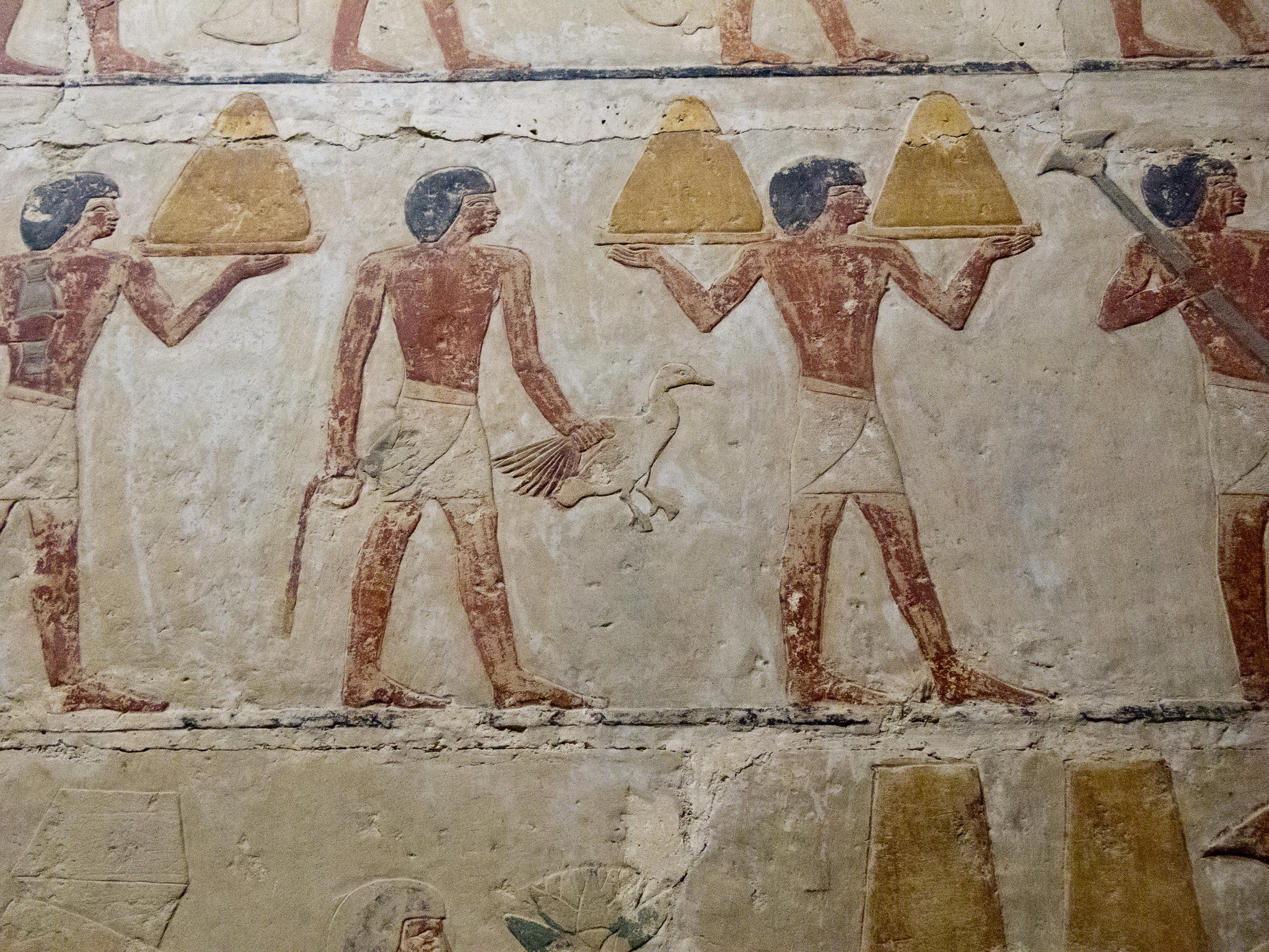 E dalle pareti della mastaba emerge, incredibilmente viva e vivida la vita di tutti i giorni: la preparazione dei campi, i mietitori, i guidatori di asini, la trebbiatura, la spulatura dei cereali; è possibile assistere alle varie fasi della costruzione delle navi di quattro millenni e mezzo fa: la segatura dei tronchi, la lavorazione delle assi, il maneggio di squadre, scalpelli e altri utensili. Per la gioia di innumerevoli studiosi di tutte le discipline afferenti all’Antico Egitto si possono riconoscere con chiarezza i vari arnesi, e vediamo come fossero già noti la sega, la scure e perfino il trapano.