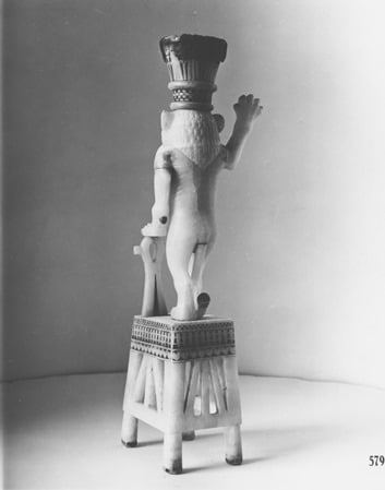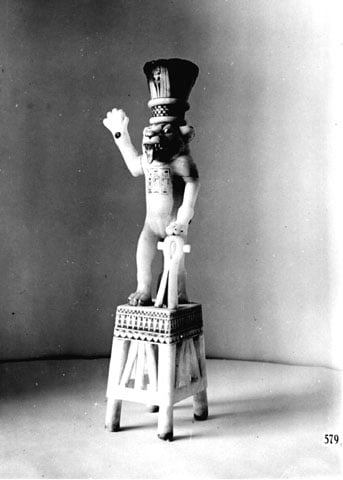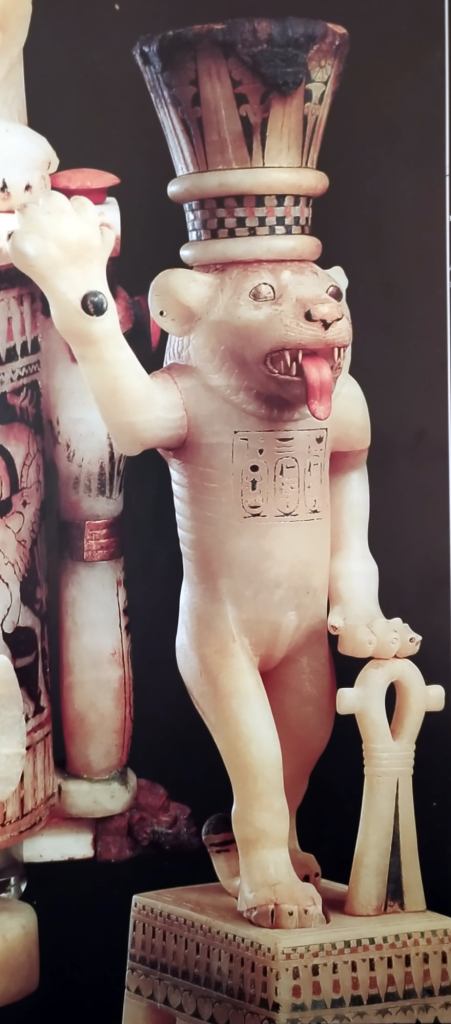 Iorwerth E.S. Edward, nel suo “Tutankhamon: la sua tomba e I suoi tesori”, vede piuttosto una rappresentazione del dio Bes: “I vasi di unguento incarnavano spesso immagini di Bes, una divinità domestica associata ai piaceri e generalmente rappresentata come un nano dalle gambe fasciate, con orecchie, criniera e coda da leone. Questo vaso è stato probabilmente scolpito in forma di leone con corona floreale a causa del collegamento tra gli animali e Bes”.Per Abeer El-Shahawy (del Museo Egizio del Cairo), invece: “Il leone, talvolta, rappresenta il dio Ra stesso, come nel capitolo 62 del Libro dei Morti (per gli egizi “Formule per poter uscire nel giorno”) che recita: “Io sono colui che è il cielo, io sono il leone di Ra””.