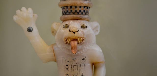 Iorwerth E.S. Edward, nel suo “Tutankhamon: la sua tomba e I suoi tesori”, vede piuttosto una rappresentazione del dio Bes: “I vasi di unguento incarnavano spesso immagini di Bes, una divinità domestica associata ai piaceri e generalmente rappresentata come un nano dalle gambe fasciate, con orecchie, criniera e coda da leone. Questo vaso è stato probabilmente scolpito in forma di leone con corona floreale a causa del collegamento tra gli animali e Bes”.Per Abeer El-Shahawy (del Museo Egizio del Cairo), invece: “Il leone, talvolta, rappresenta il dio Ra stesso, come nel capitolo 62 del Libro dei Morti (per gli egizi “Formule per poter uscire nel giorno”) che recita: “Io sono colui che è il cielo, io sono il leone di Ra””.