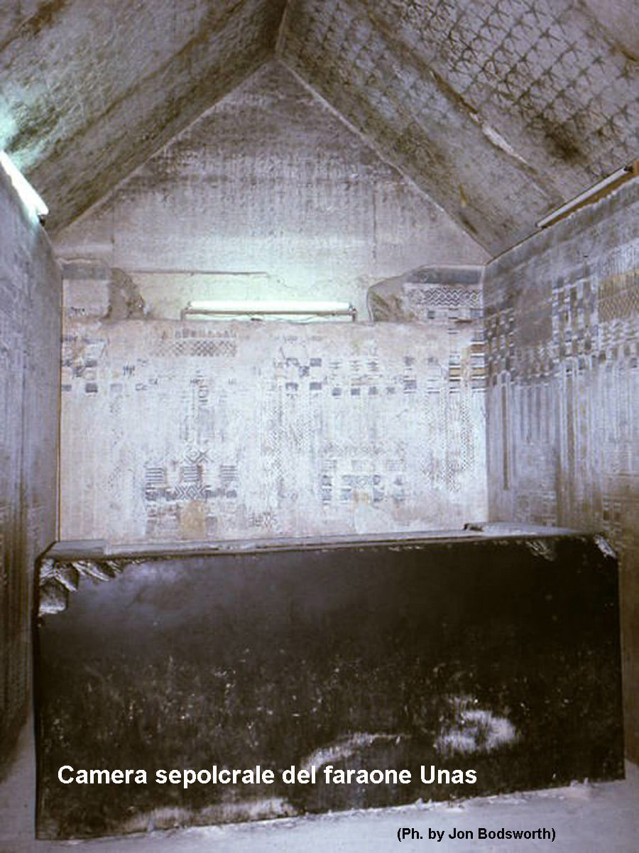 Abbiamo parlato della piramide del faraone Unas (o Unis), ultimo sovrano della V dinastia che, a differenza dei suoi predecessori, le cui piramidi non presentano iscrizioni od incisioni di alcun genere, le camere della sua ne sono interamente ricoperte.