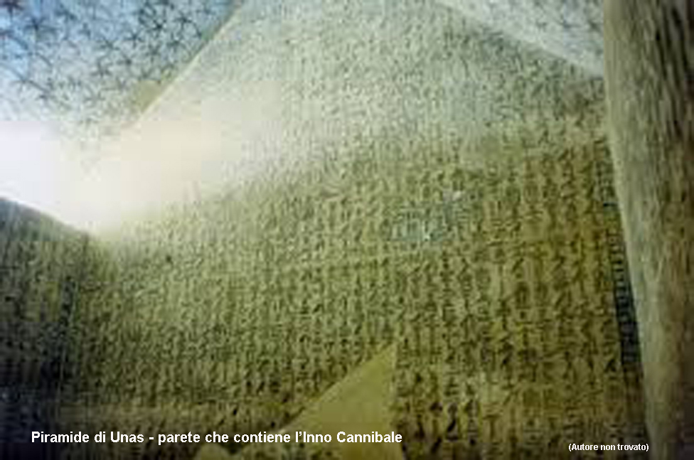 Si tratta del cosiddetto “Inno cannibale”. L’Inno cannibale è un documento letterario straordinario che si compone di due incantesimi, (Testi delle Piramidi 273 e 274), iscritti sul frontone orientale dell’anticamera della tomba del faraone Unas. Ernest Wallis Budge ritiene che l’inno abbia origini molto antiche, addirittura preistoriche e preistoriche che veniva trasmesso oralmente di generazione in generazione da tempi remotissimi.