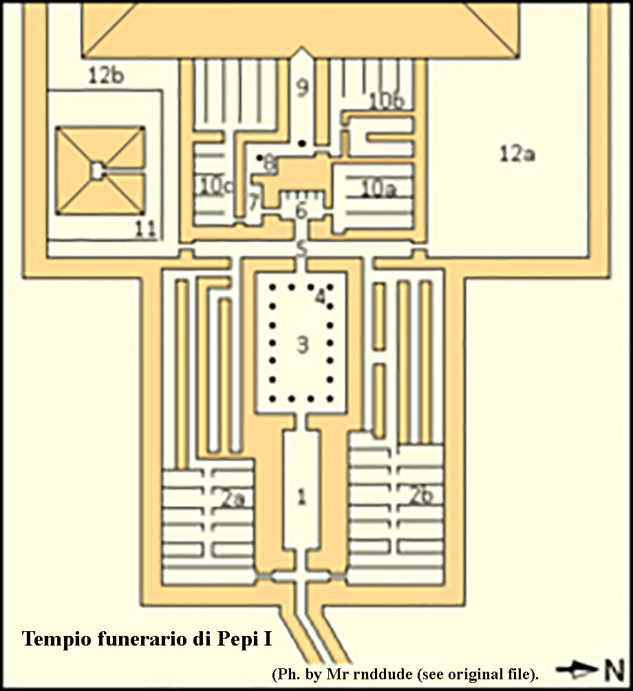Il tempio funerario si presenta gravemente danneggiato in quanto già fin dal passato divenne una cava di pietra ma, grazie al lavoro degli archeologi, è stato possibile ricostruire la pianta e le caratteristiche del tempio. La costruzione ricalca quella dei templi di Djedkare Isesi, Unas e Teti. Attraverso un ingresso si raggiunge un cortile colonnato, da qui si arriva ad una sala fiancheggiata da magazzini sui lati nord e sud. All’interno di una cappella si trovavano cinque nicchie che in origine dovevano contenere statue, probabilmente del faraone. Nella sezione sud-occidentale del tempio interno si trovavano diverse statue che rappresentavano prigionieri inginocchiati e legati con le mani dietro la schiena, tutte si presentavano rotte al collo e alla vita. Miroslav Verner afferma che queste statue un tempo fiancheggiavano un cortile aperto con colonne, e forse anche l’atrio, dove servivano per allontanare chiunque minacciasse la tomba. Secondo Richard Wilkinson non è possibile stabilire la posizione originale di queste statue. Frammenti della decorazione a rilievo furono recuperati da Labrousse. Passiamo ora ad esaminare la piramide cultuale che si presenta meglio conservata del tempio funerario. Dall’esame dei frammenti di statue, stele e tavoli delle offerte si deduce che il culto di Pepi I continuò ancora nel Medio Regno. La piramide presenta una camera funeraria che pare non essere mai stata usata, potrebbe aver ospitato una statua del re o il suo ka in occasione di rituali inerenti sulla festa Sed.
