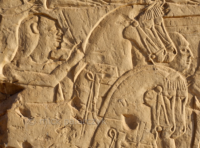 Ramses promise di onorare i suoi valorosi cavalli, e mantenne la parola, in vari modi: nei testi, nelle raffigurazioni, nell’anello al Louvre ma… anche in un bellissimo modo, tutto egizio.Nelle tre foto vediamo una scena che si trova sul muro esterno ovest, lato nord, del tempio di Luxor.