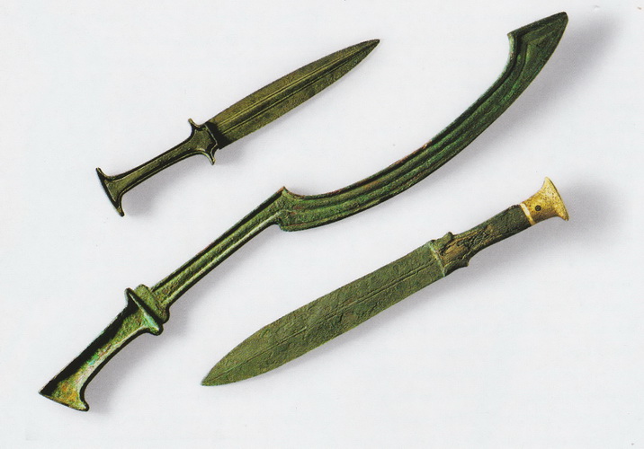 Le principali armi dell’esercito egizio del tempo: pugnale, spada da combattimento ravvicinato ed al centro il “Khopesh”, usato soprattutto come arma da taglio sui carri e poi con un ruolo tradizionale e simbolico.