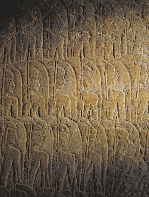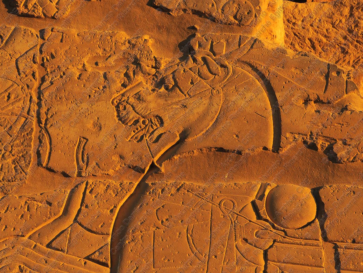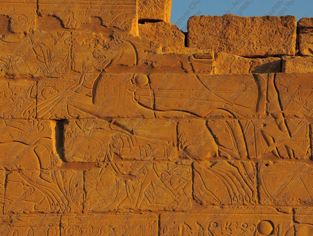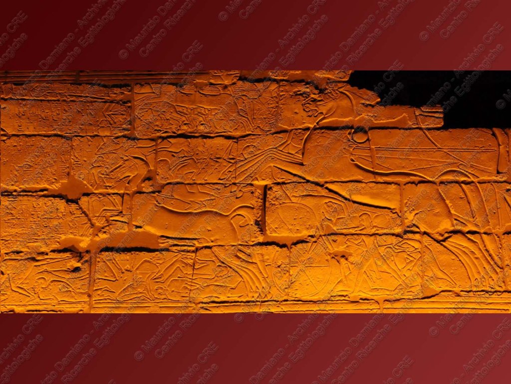 Si tratta della carica di Ramses II nella battaglia asiatica di Dapur. Vediamo i carri e Ramses (di cui è persa la parte superiore) con il suo carro trainato dai coraggiosi cavalli.