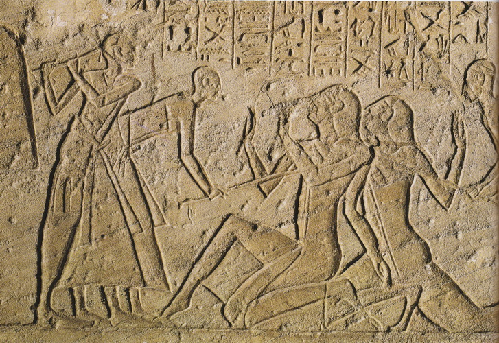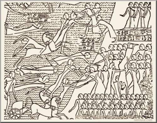 Alcuni uomini muoiono nell’acqua. Il principe di Aleppo viene tenuto a testa in giù dai suoi soldati per fargli espellere l’acqua ingoiata. (Rilievo di Breasted dal Ramesseum)