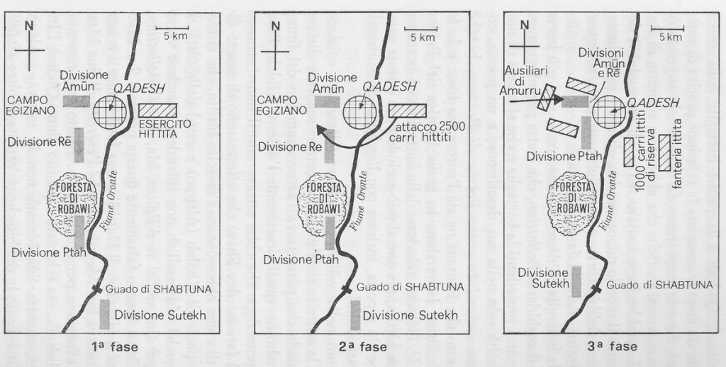 Ramses risale l’attuale Palestina con la sue Divisioni schierate il fila indiana a qualche chilometro una dall’altra per evitare il più possibile la polvere che si alza al passaggio di ogni gruppo. Prima di attraversare l’Oronte, cattura due beduini shasu che gli raccontano come il “vile Muwatalli” sia ancora a nord di Aleppo, timoroso di scontrarsi con il divino Faraone. Ovviamente è una balla colossale, ma Ramses, assetato di gloria e fama, non prende neanche in considerazione questa possibilità e si lancia in avanti con il suo esercito. Attraversa l’Oronte con la Divisione Amon e la sua guardia del corpo personale composta dagli Sherdani, i Guerrieri del Mare, ed invece di aspettare le altre Divisioni supera la foresta di Robawi sulla riva occidentale del fiume e marcia su Kadesh.