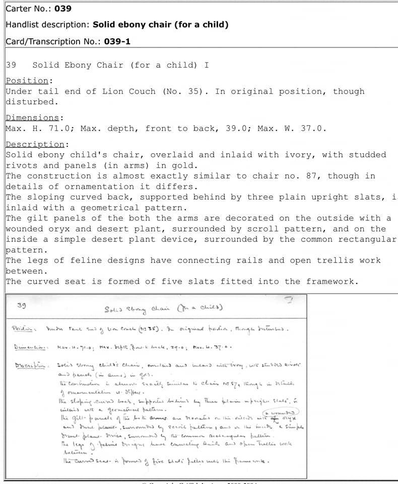 La seduta ha doppia curvatura e lo schienale è inclinato, la sedia non ha braccioli.Fra le gambe ci sono dei pannelli lavorati a giorno che fungono da supporti e sono decorati con i fiori di loto e papiri, piante araldiche che simboleggiano l’Alto e il Basso Egitto.