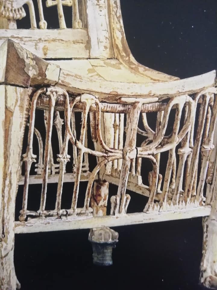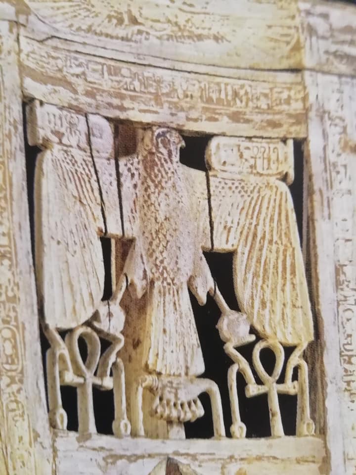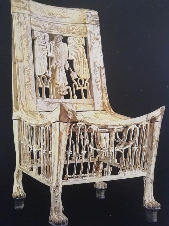 Sull’alto schienale è raffigurato Horo in forma di falco, mentre dispiega le ali, a protezione del re seduto sulla sedia, fra gli artigli tiene i segni shen, simboli dell’eternità e al di sotto delle ali ci sono due ankh, simboli della vita, fra scettri was, emblemi di potere e autorità.